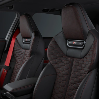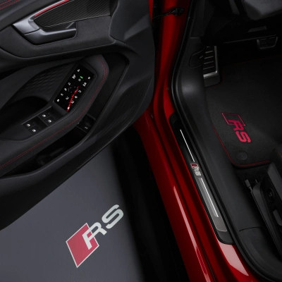 Dankzij het RS-specifieke ontwerp van de voor- en achterkant, verkrijgbaar met keuze uit accenten in carbon3 of matte koolstofcamouflage3 . De RS-honingraatstructuur in het radiatorrooster en het RS-embleem dragen bij aan het exterieur. Audi-ringen in antracietgrijs en standaard zwarte accenten aan de voor-, zij- en achterkant ronden het design af.