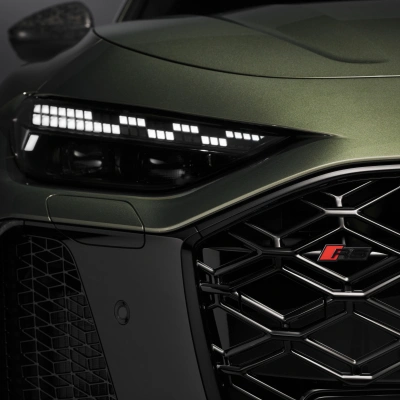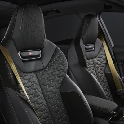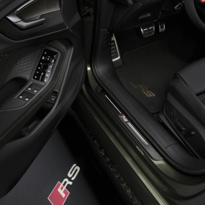 Dankzij het RS-specifieke ontwerp van de voor- en achterkant, verkrijgbaar met keuze uit accenten in carbon3 of matte koolstofcamouflage3 . De RS-honingraatstructuur in het radiatorrooster en het RS-embleem dragen bij aan het exterieur. Audi-ringen in antracietgrijs en standaard zwarte accenten aan de voor-, zij- en achterkant ronden het design af.